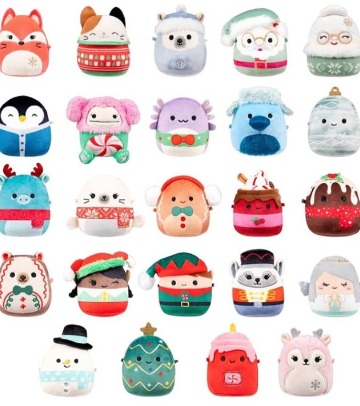 - 24 micro plushies (2.5-inch) featuring holiday favorites like snowmen, reindeer, and penguins in festive outfits.