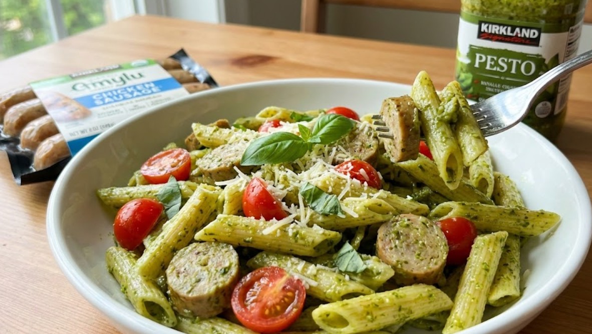A simple, delicious meal combining two of Costco’s best pre-made items: pre-cooked sausage and fresh pesto.