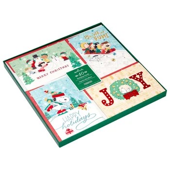 Get ready for holiday greetings with this festive Peanuts-themed Hallmark card set. Featuring Snoopy and friends in four unique designs, each box includes 40 premium cards with self-sealing foil-accented envelopes — perfect for spreading cheer affordably.