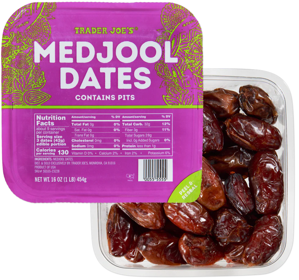 Description: Large, sweet, pitted dates found in the dried fruit or produce section.