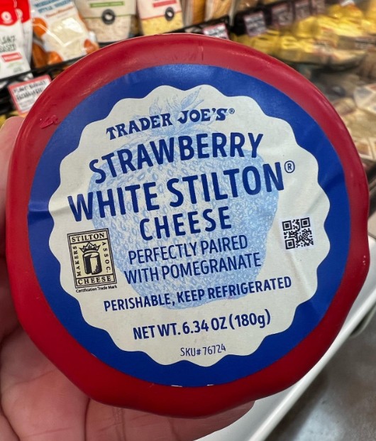 Description: A crumbly English Stilton cheese blended with dried strawberry pieces.