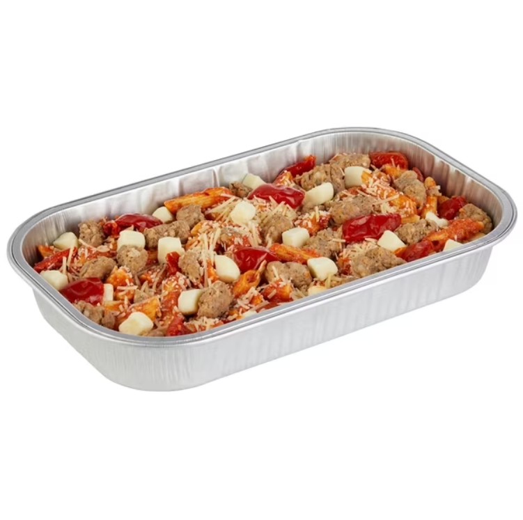 Description: A large, oven-ready tray of penne with Italian sausage and a protein-fortified sauce.