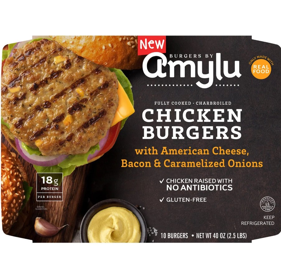 Description: A 10-count pack of fully cooked, antibiotic-free chicken burgers (often in Roasted Garlic or Caramelized Onion).