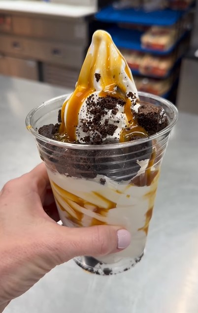 - Vanilla ice cream with brownie chunks and caramel drizzle.