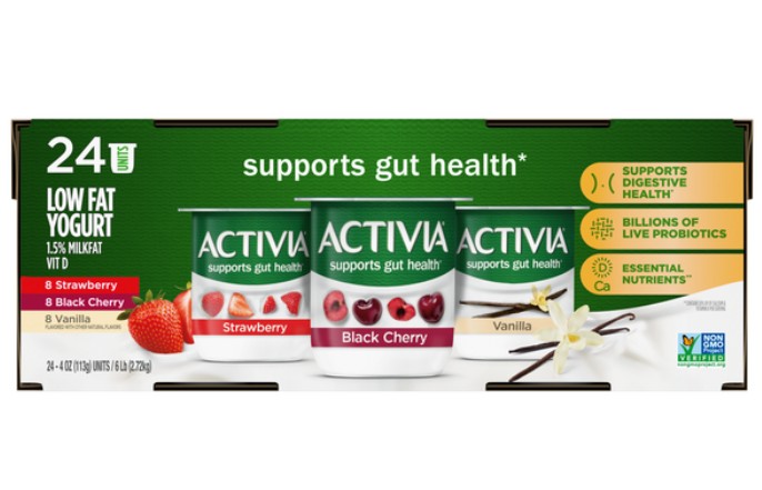 Gut-friendly yogurt packed with billions of probiotics in flavors like strawberry and vanilla.