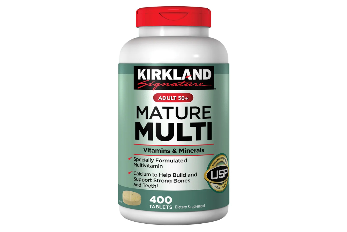 Description: Large bottles of multivitamins (like Mature Multi 50+) or Vitamin D.