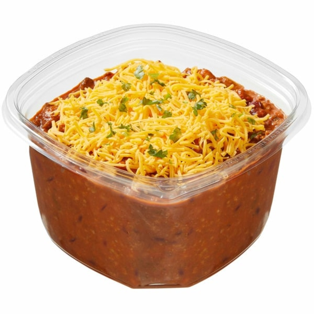 - Hearty chili with beef, beans, and cheese topping, ready to heat.