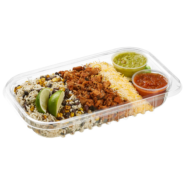 - Rice, beans, chicken, veggies, and toppings, ready to heat.