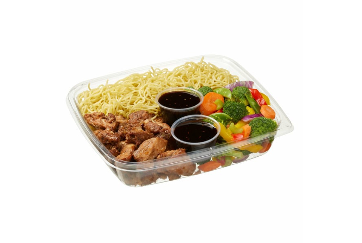 - Noodles with chicken, veggies, and teriyaki sauce, ready to heat.