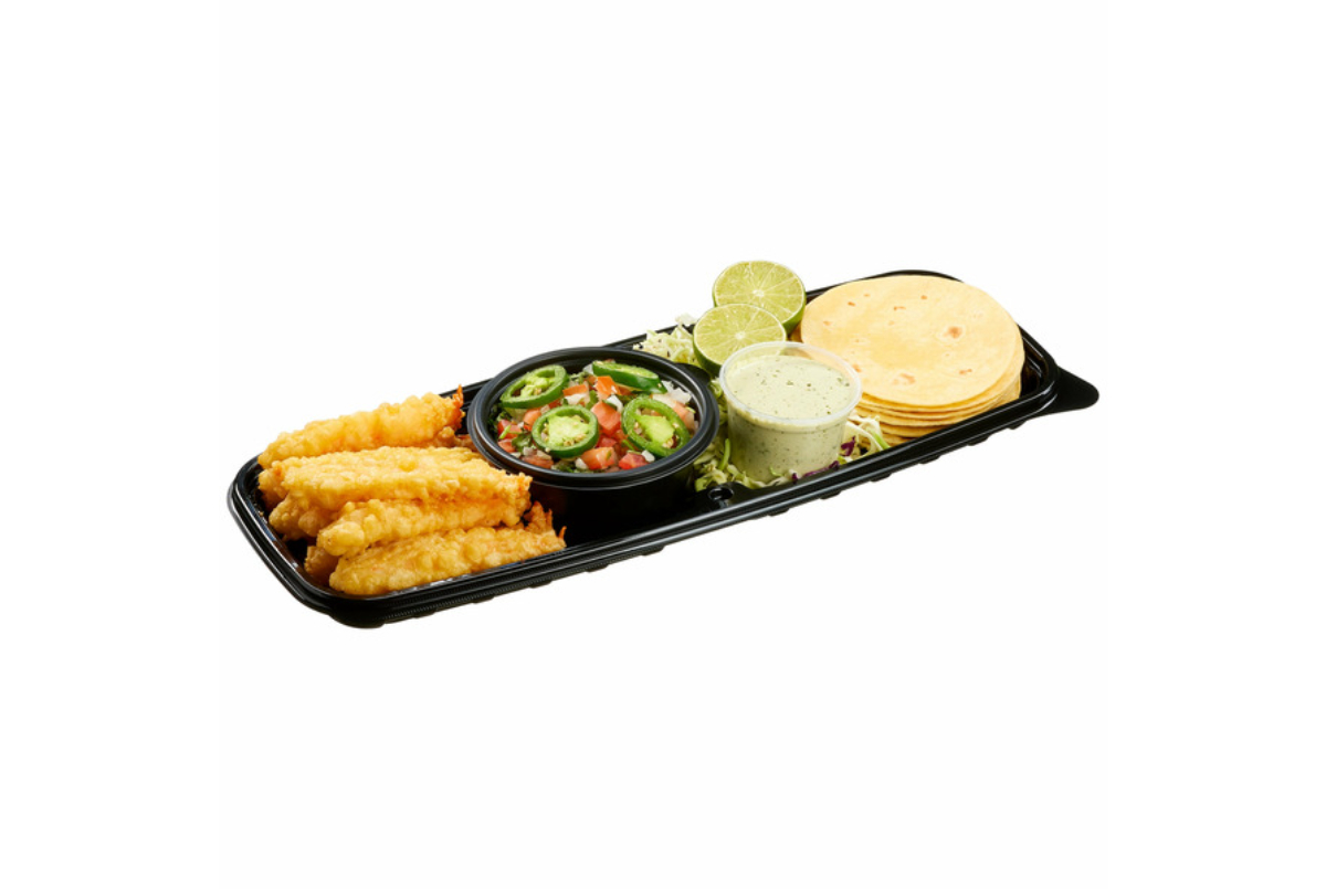 - Kit with battered shrimp, tortillas, slaw, pico, and crema for 12 tacos.