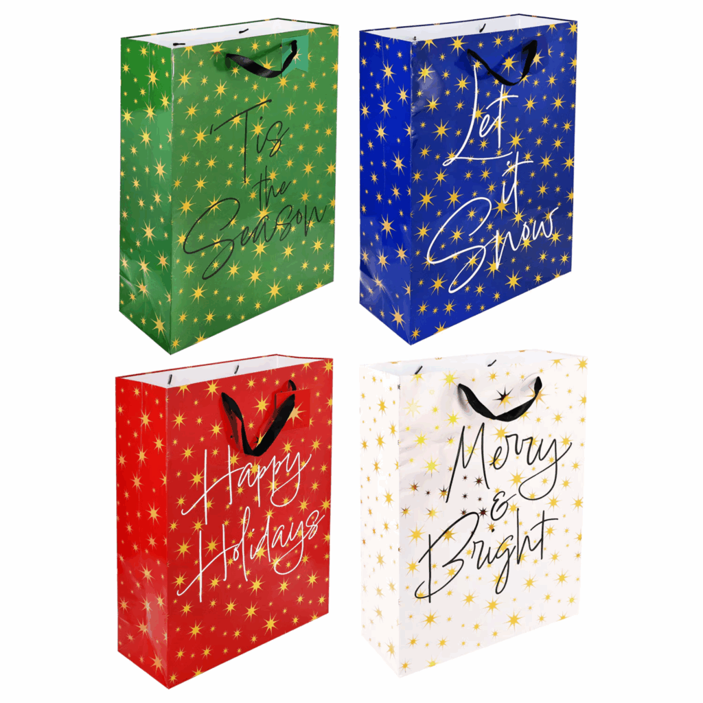 - Oversized gift bags bursting with starry patterns and jolly messages boast sturdy handles and thick paper for boutique-level charm. Perfect for wrapping bulky presents like toys or sweaters, they simplify gifting with style, ensuring your surprises arrive wrapped in wow-factor wonder.