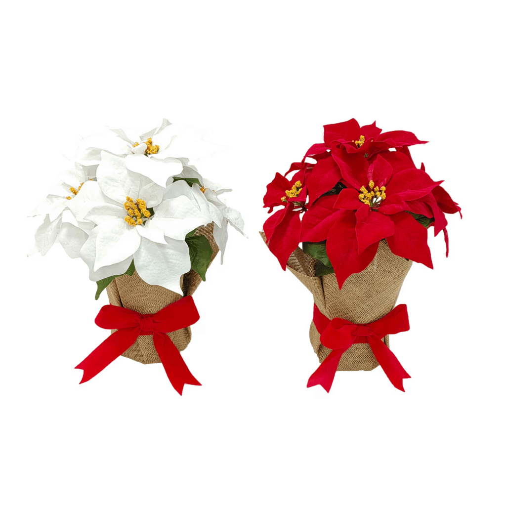 - Lifelike faux poinsettias in a charming burlap-wrapped pot deliver rustic farmhouse allure for entry tables or shelves. Vibrant red blooms stay fresh year-round, offering low-maintenance cheer that anchors holiday vignettes beautifully, all while fitting snugly into tight budgets.