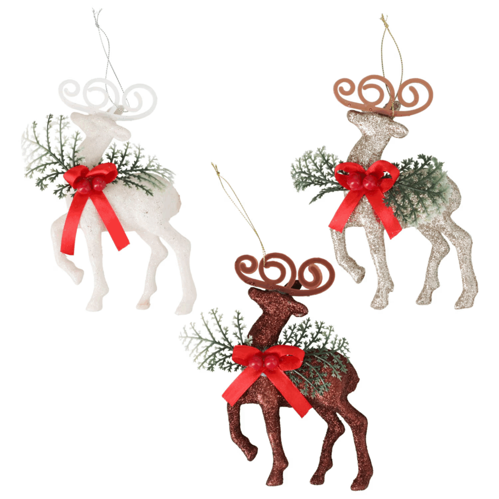 - Dazzling reindeer ornaments in gold, white, and red sparkle with luxurious shimmer, dangling gracefully from trees or wreaths. Lightweight yet detailed, they add playful glam to your decor, delighting kids and adults alike while keeping festive flair front and center for pennies.