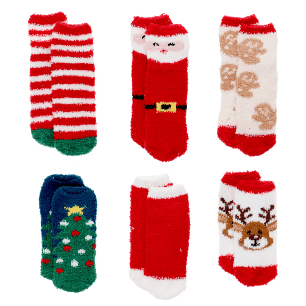 - Plush, fuzzy socks in merry holiday prints and colors feature grippy soles for safe lounging around the house. Cozy and breathable, they’re ultimate stocking stuffers or self-care treats, wrapping feet in festive comfort that keeps slips at bay during wintry fun.