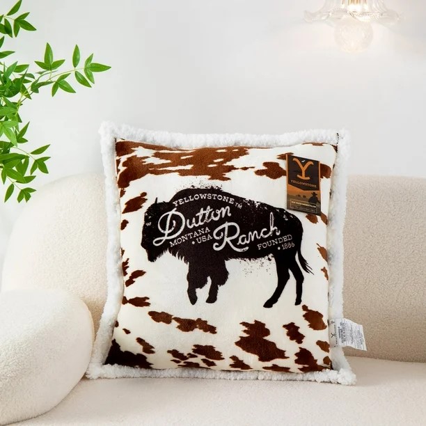 Add Western charm to your space with this Yellowstone-inspired throw pillow. The front features the show’s insignia, while the back is made from plush sherpa for ultimate coziness. Its neutral tones blend seamlessly with fall décor, making it a stylish seasonal upgrade for any couch or bed.