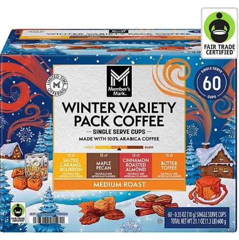 Stock up on bulk-sized ground coffee, flavored creamers, and syrups like caramel and vanilla.