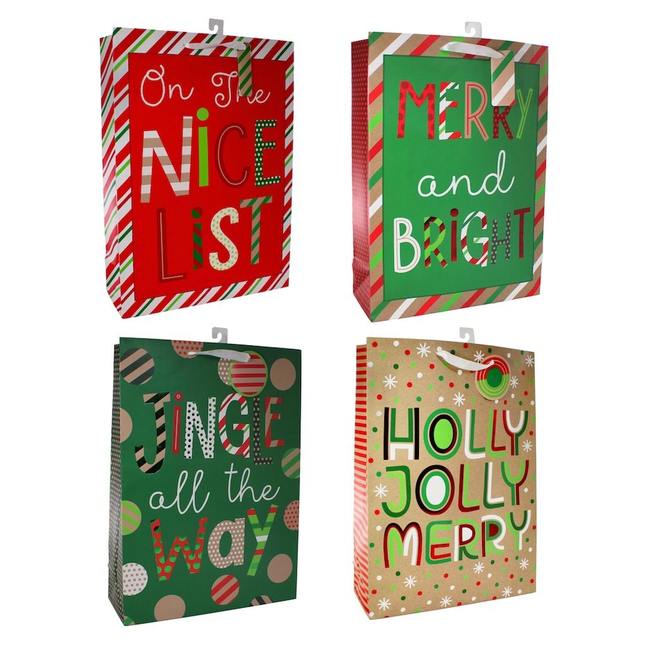- Festive scripted designs in a three-pack handle medium presents with reusable flair. Sturdy handles and reinforced bottoms prevent spills. Ditch pricey paper—stuff with treats for teachers or Secret Santa, adding handwritten notes for heartfelt, eco-smart wrapping wins.