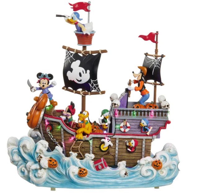 A rocking pirate ship that plays spooky music, sizable and engaging for creating an adventurous Halloween atmosphere.