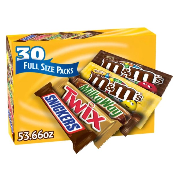 Full-size bars including M&Ms, Twix, Milky Way, and Snickers, a premium option for generous trick-or-treating without skimping on size.