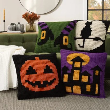 A 22″ x 22″ pillow in fun themes like pumpkin, cat, haunted house, or witch shoes, with zipper closures for easy cleaning, perfect for adding seasonal flair to your home decor.