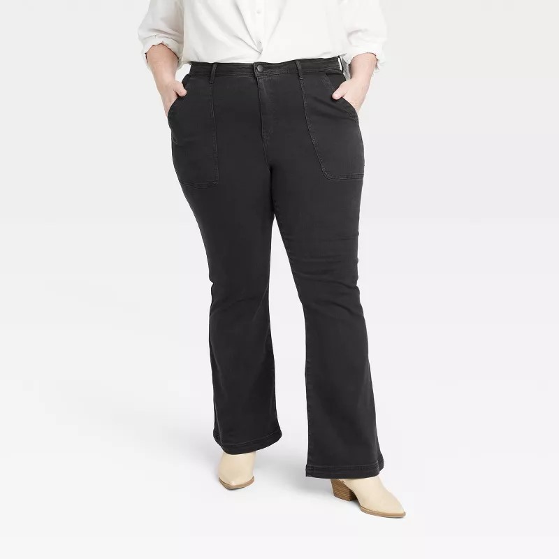 Bootcut flare with stretch band waist, ideal for curvy figures, comfortable and stylish for fall transitions.