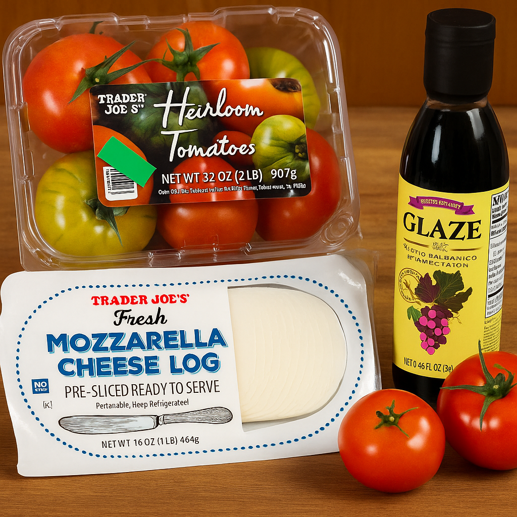- Ingredients & Prices: Fresh Mozzarella Log ($6.49/16 Oz), Heirloom Tomatoes ($4.99/pack), Balsamic Glaze ($2.99/8.45 Fl Oz).