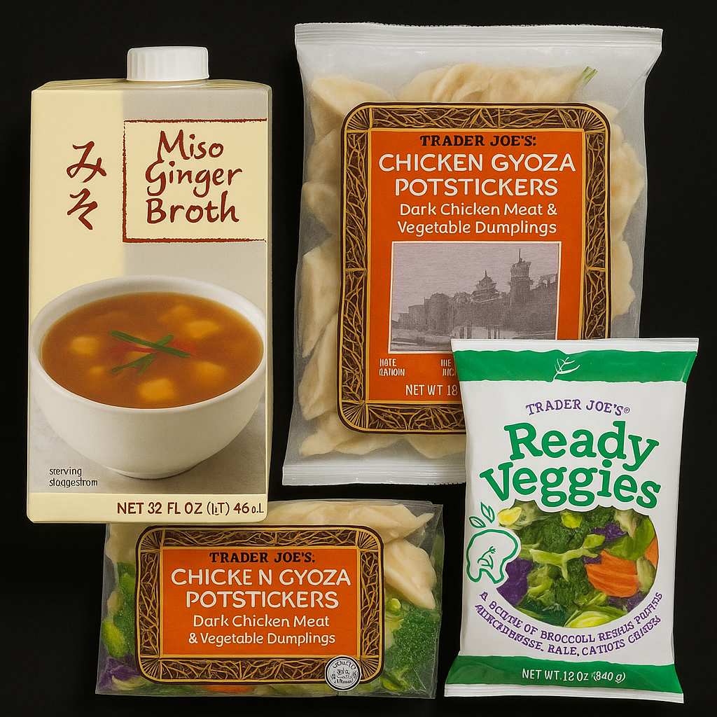 - Ingredients & Prices: Chicken Gyoza Potstickers ($3.99/16 Oz), Miso Ginger Broth ($2.49/32 Fl Oz), Frozen Mixed Veggies ($2.99/12 Oz).