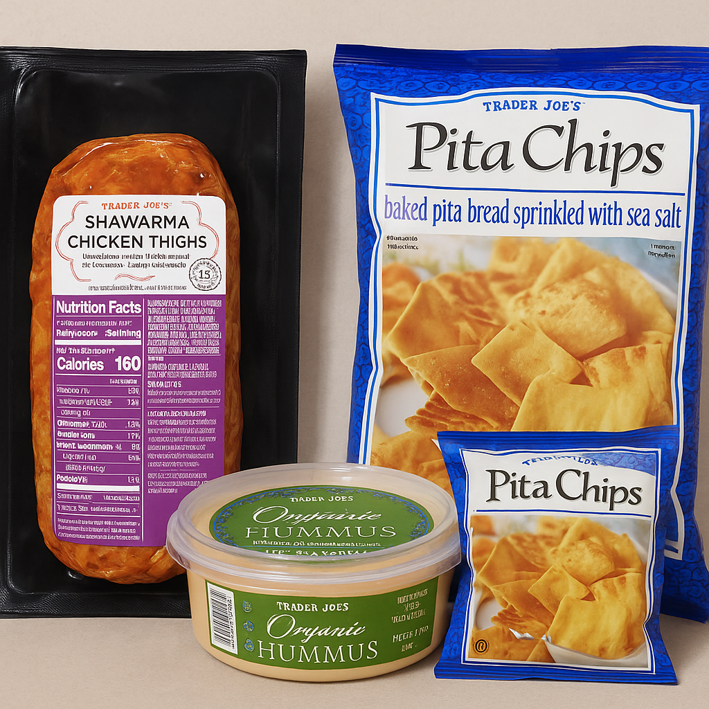 - Ingredients & Prices: Shawarma Chicken Thighs ($6.99/1 Lb), Hummus ($2.99/8 Oz), Pita Chips ($2.49/6 Oz).