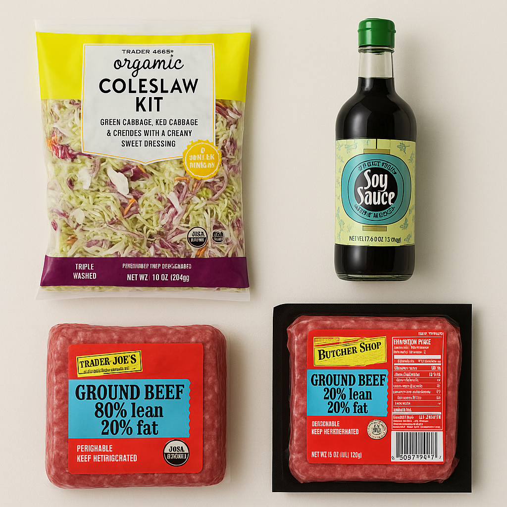 - Ingredients & Prices: Coleslaw Mix ($2.99/10 Oz), Ground Meat ($5.49/1 Lb), Soy Sauce ($3.99/17.6 Fl Oz).