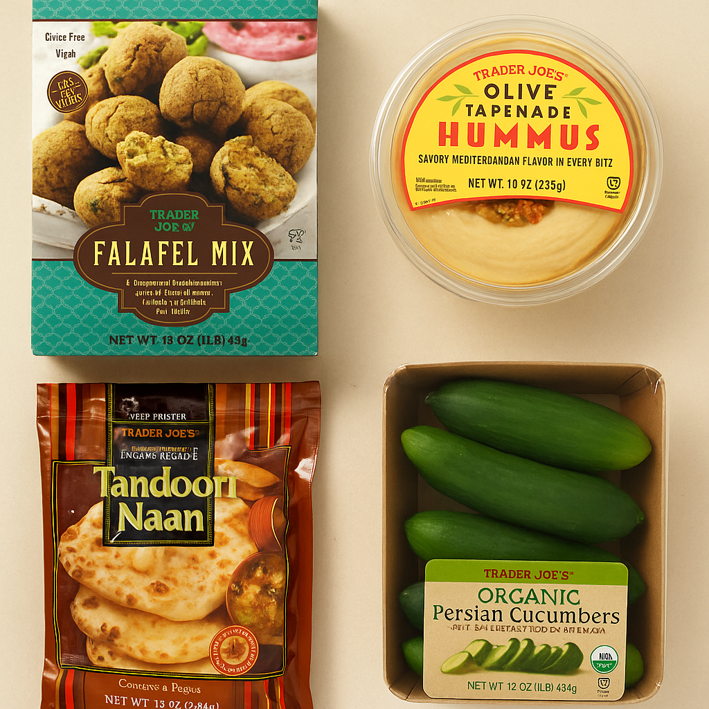 - Ingredients & Prices: Falafel Mixl ($3.29/16 Oz), Olive Tapenade Hummus ($3.49/10 Oz), Organic Persian Cucumbers ($2.99/16 Oz), Tandoori Naan ($2.99/12 Oz).
