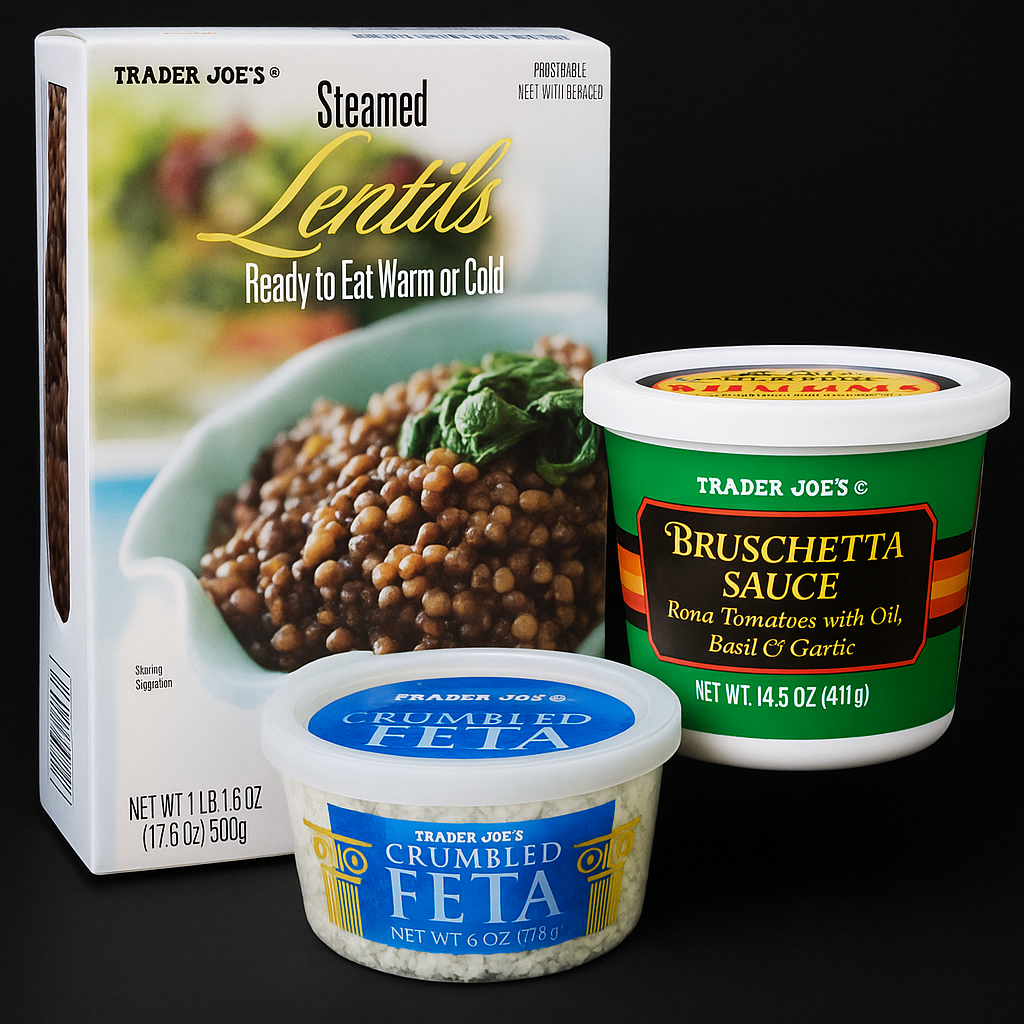 - Ingredients & Prices: Steamed Lentils ($3.29/17.63 Oz), Crumbled Feta ($3.29/6 Oz), Bruschetta Sauce ($2.99/14.5 Oz).