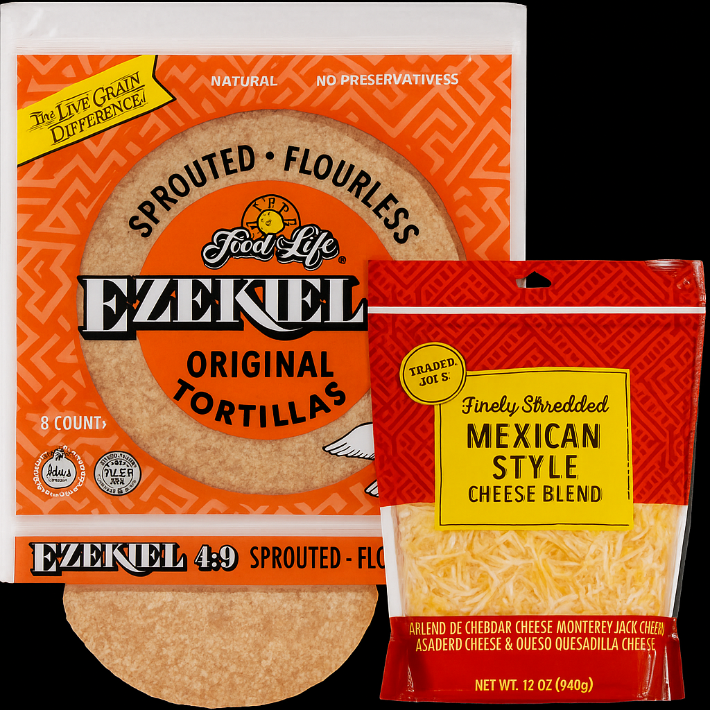 - Ingredients & Prices: Ezekiel Tortillas ($3.99/pack of 6), Shredded Mexican Cheese Blend ($3.99/12 Oz).