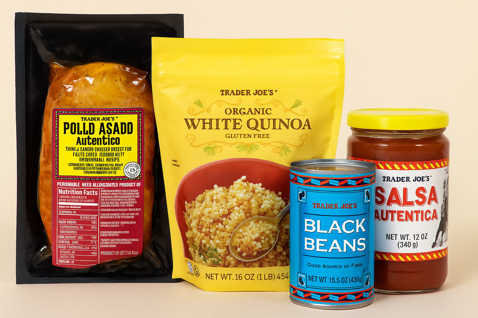- Ingredients & Prices: Pollo Asado ($8.49/1 Lb), Organic White Quinoa ($3.49/16 Oz), Black Beans ($0.99/15.5 Oz), Salsa Autentica ($2.29/12 Oz).