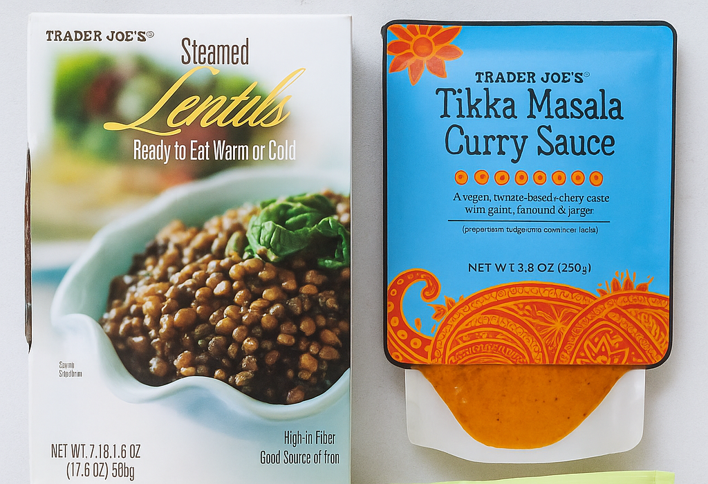 - Ingredients & Prices: Steamed Lentils ($3.29/pack), Tikka Masala Curry Sauce ($2.29/8.8 Oz).