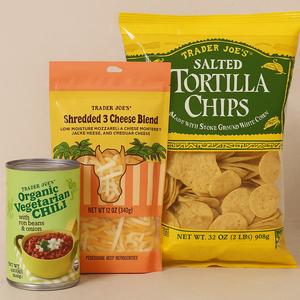 - Ingredients & Prices: Vegetarian Chili ($2.49/14.67 Oz), Tortilla Chips ($3.49/32 Oz), Shredded Cheese ($4.29/12 Oz).