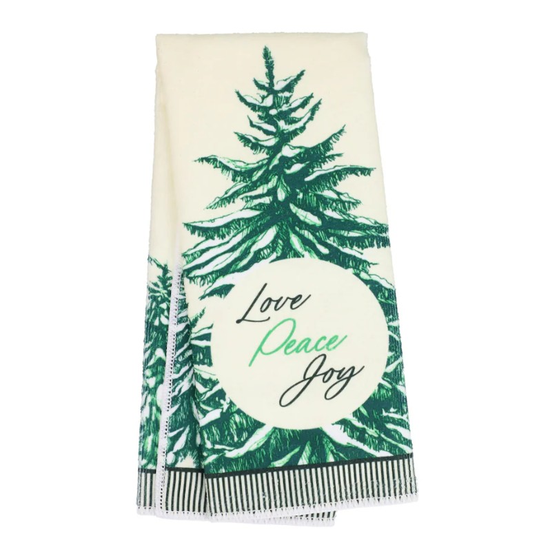 Dry dishes in delight with these 15-by-25-inch polyester towels printed with lush green trees and “Love. Peace. Joy” script. Absorbent, low-lint, and machine-washable, they bring holiday warmth to kitchens—cozier and cheaper than high-end sets.