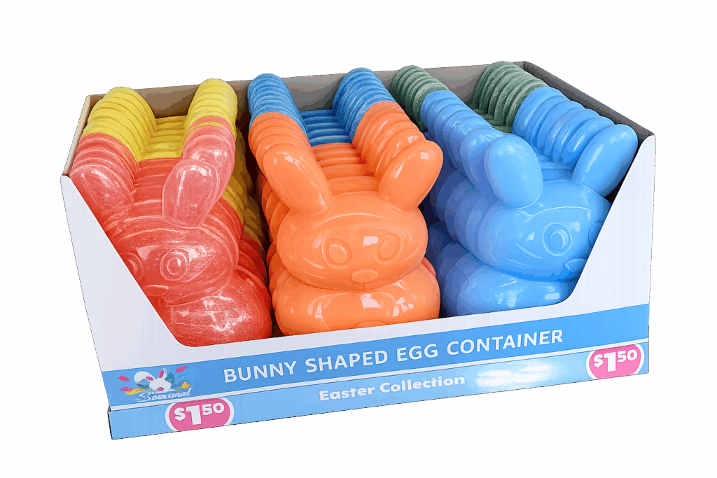 - Description: A bunny-shaped plastic container meant to hold eggs or small treats. Perfect for Easter baskets, egg hunts, and classroom parties.