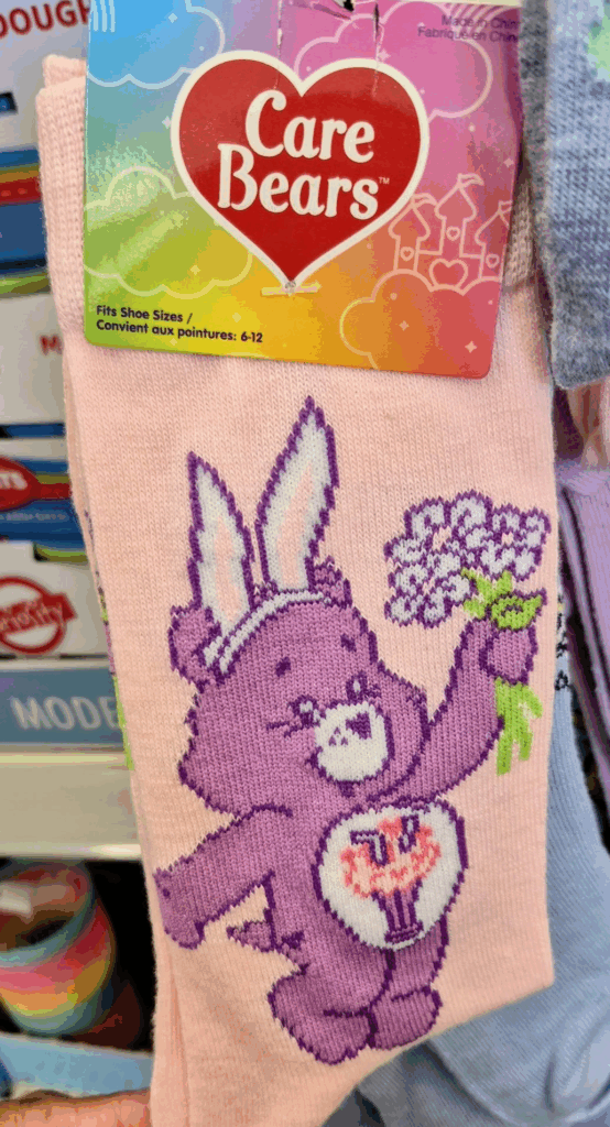 - Description: Soft crew socks featuring a Care Bears character in a springy pastel design. Great for nostalgic shoppers or gift baskets.