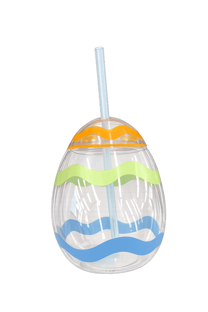 - Description: A clear egg-shaped cup with a straw and colorful wavy stripe design. Great for juice, water, or party punch.