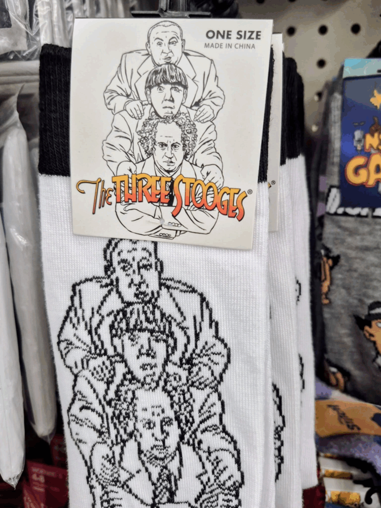 - Description: Novelty socks featuring The Three Stooges in a bold retro design. Great for collectors, gag gifts, or anyone who loves classic TV.