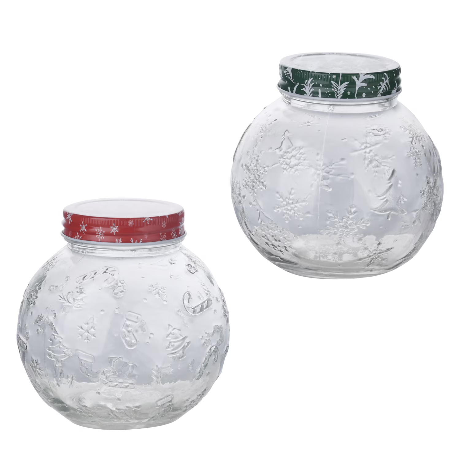 - Embossed clear and green jars with winter motifs, great for shelf decor, storing holiday treats, or holding spare change with festive flair.