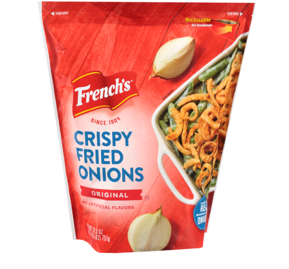 - Crispy, golden onions in a large canister for topping green bean casseroles or salads.