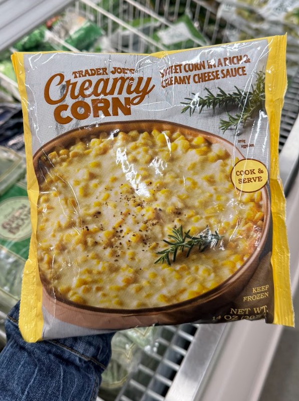 - Frozen sweet corn in cheddar-shallot cream sauce.