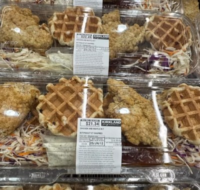 A viral Costco favorite — Belgian waffles paired with boneless fried chicken thighs, syrup, and hot honey.