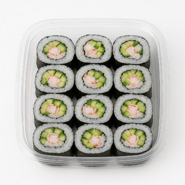 Imitation crab, rice, seaweed, cucumber, avocado, sauces.