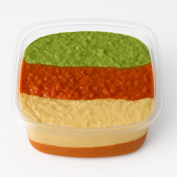 Chickpeas, tahini, lemon juice, olive oil, roasted red peppers, herbs.