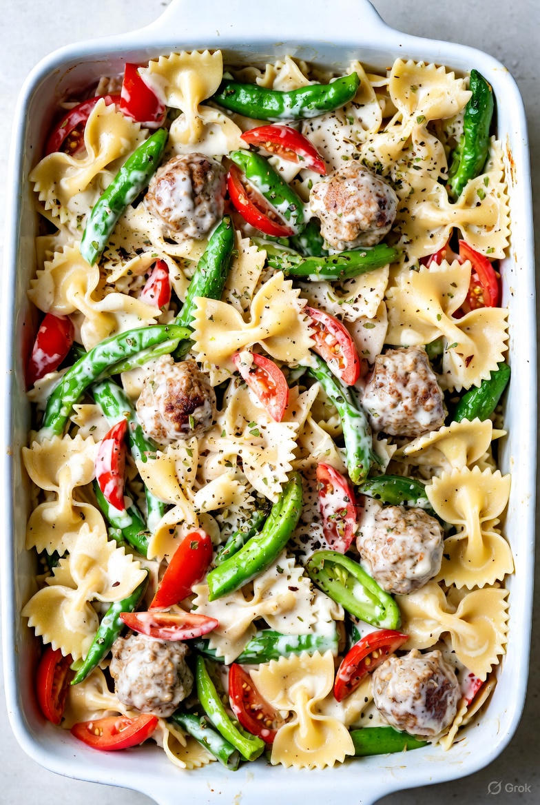 Add meatballs, alfredo sauce and vegetables to the pasta. Stir until well-coated.