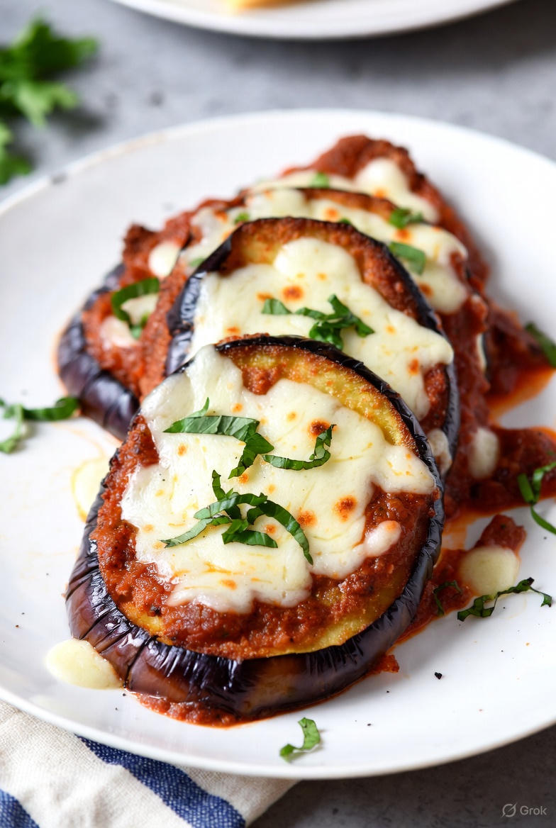 Cover the eggplant with foil and bake for 20 minutes or until tender. Remove from the oven. Uncover and lay the mozzarella slices on top.