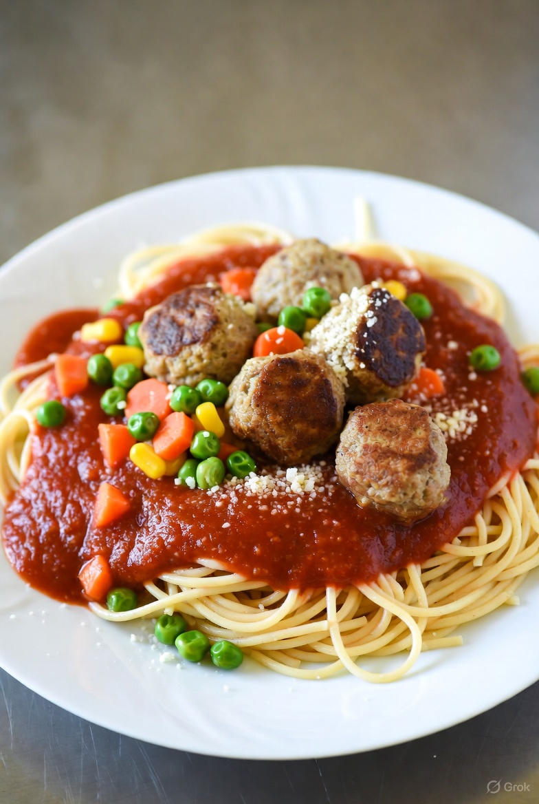 Heat the sauce in a large saucepan or Dutch oven over medium heat. Toss the pasta with the tomato sauce. Stir in the meatballs and vegetables.