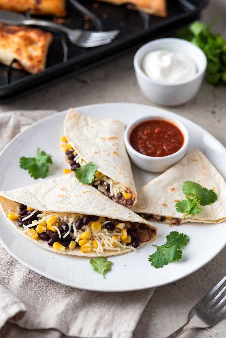 Top with about half the cheese, black beans, corn and remaining cheese. Place 2 more tortillas in the middle, folding the bottom-layer tortillas over the edges to cover the filling.